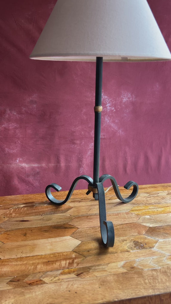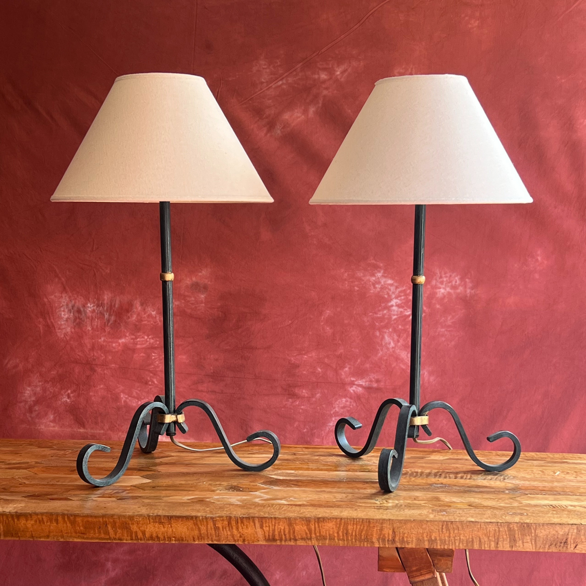 This piece embodies the spirit of French provincial craftsmanship. A refined pair of forged iron lamps, each a study in craftsmanship. The hand-forged tripod bases curve in scrolls - elegant, and undeniably human in touch. Their silhouettes recall the sculptural restraint of Jean Royère. Topped with soft empire linen shades, the pairing of pale fabric and dark iron feels deliberate and balanced - the interplay between weight and lightness, masculine and feminine. Perfect on a console, beside a bed or flanking a sofa, they bring structure and calm to any room, casting a warm and poetic light. There is a very subtle dark green verdigris to these lamps, but mostly the lamps read black.