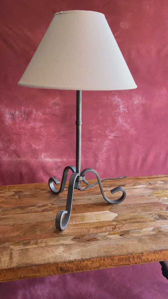 This piece embodies the spirit of French provincial craftsmanship. A refined pair of forged iron lamps, each a study in craftsmanship. The hand-forged tripod bases curve in scrolls - elegant, and undeniably human in touch. Their silhouettes recall the sculptural restraint of Jean Royère. Topped with soft empire linen shades, the pairing of pale fabric and dark iron feels deliberate and balanced - the interplay between weight and lightness, masculine and feminine. Perfect on a console, beside a bed or flanking a sofa, they bring structure and calm to any room, casting a warm and poetic light.