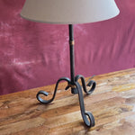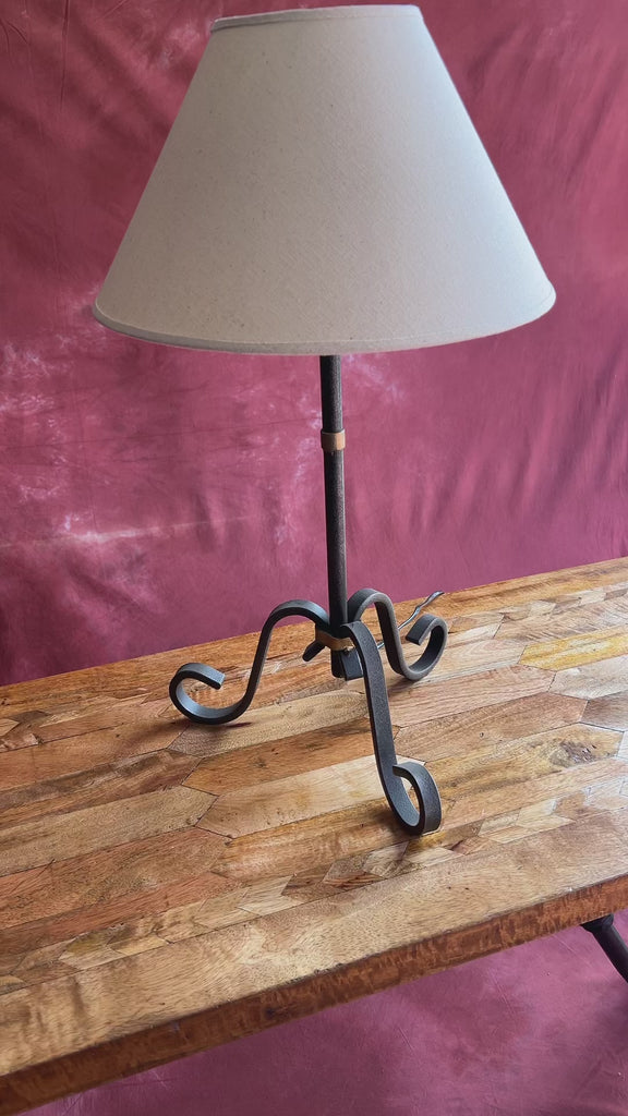This piece embodies the spirit of French provincial craftsmanship. A refined forged iron lamp, a study in craftsmanship. The hand-forged tripod base curve in scrolls - elegant, and undeniably human in touch. Their silhouettes recall the sculptural restraint of Jean Royère. Topped with a soft empire linen shade, the pairing of pale fabric and dark iron feels deliberate and balanced - the interplay between weight and lightness, masculine and feminine. Perfect on a console, beside a bed or flanking a sofa, they bring structure and calm to any room, casting a warm and poetic light.