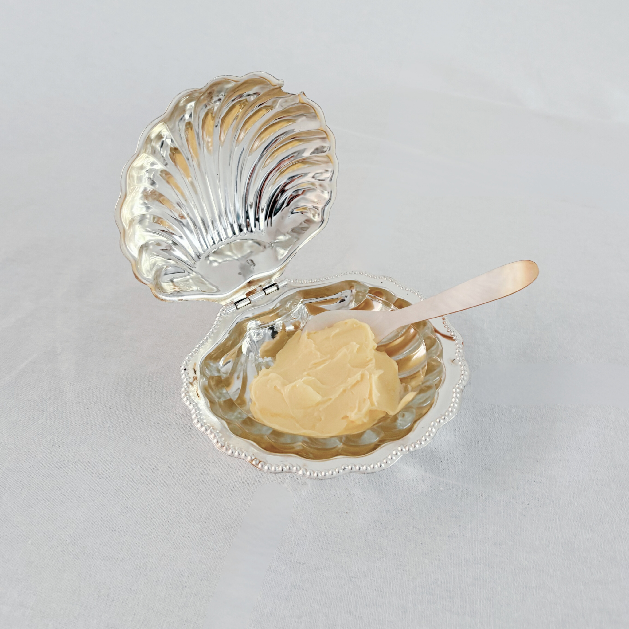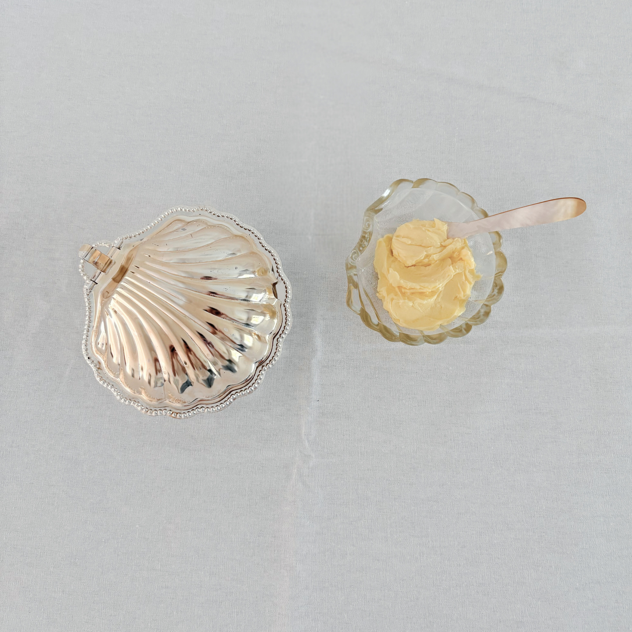 A silver-plated shell dish with a hinged lid and softly rippled form. Light in the hand and sculptural on the table, it pairs beautifully with the included mother-of-pearl spoon. Use it for butter, salt, caviar or small sweets. The interior has a gentle patina from age that adds character to the silvered surface. Comes with glass insert.