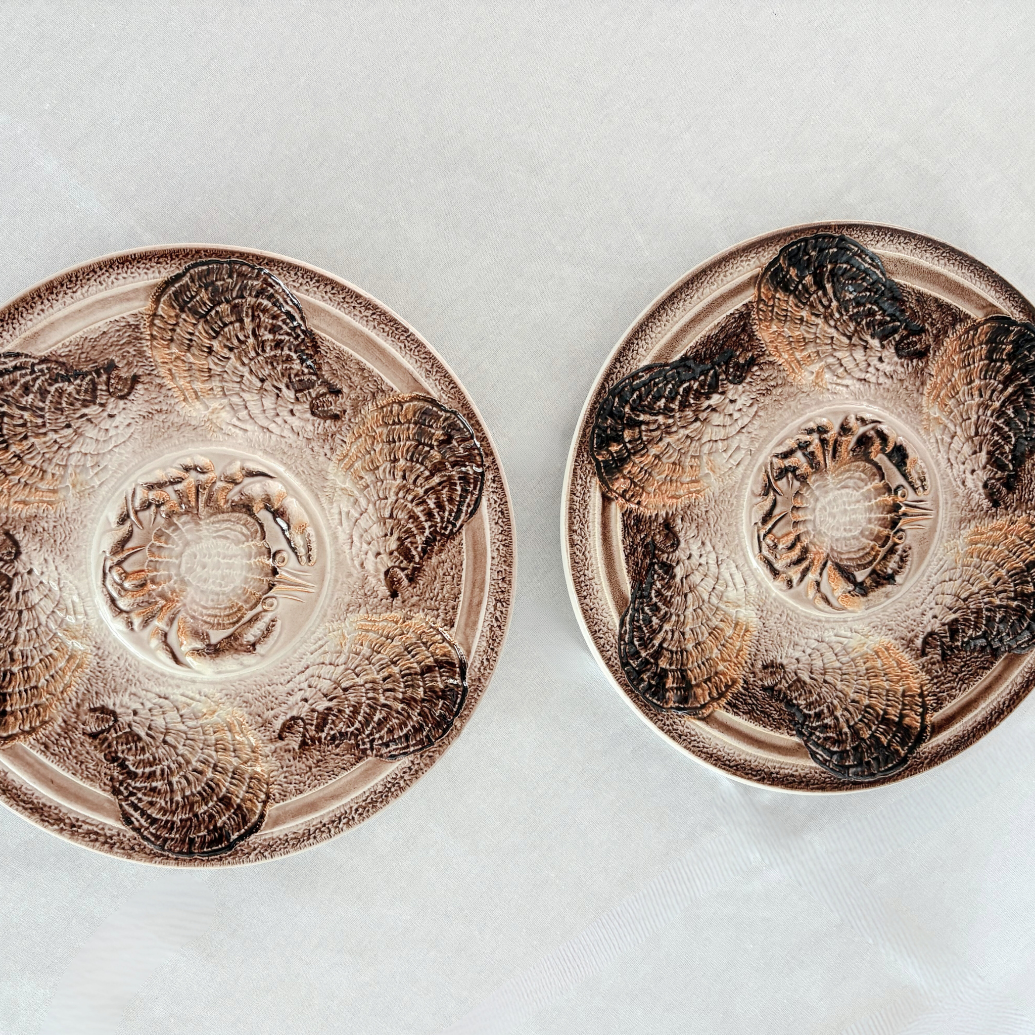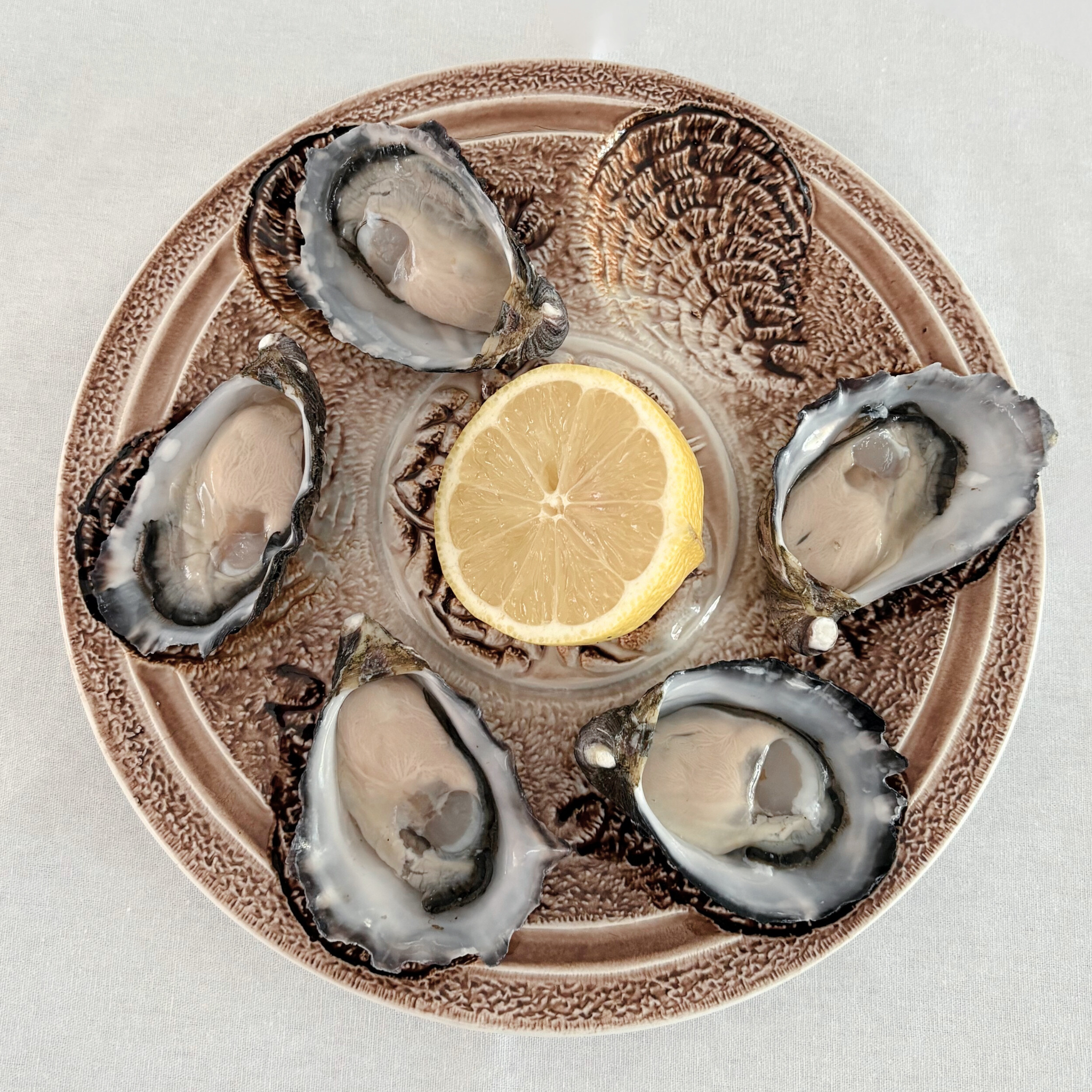 Highly collectable French faience oyster plates with sculptural, hand-glazed detailing in warm sandy browns and caramel tones. Each plate features six deeply moulded shell wells arranged around a central crab motif, with the glaze settling beautifully into the textured relief. The finish carries the earthy, tactile quality of mid-century French ceramics. The sculpted shells and central crab motif give these plates a collected, seaside elegance that suits both display and use. Made in France in the 1950's at Atelier du Revernay, where artists created designs for Sarreguemines, these plates are now highly collectible. Weighty, expressive and handmade. Hang on the wall, display on a flat surface, or scatter with oysters or crudités. Place a lemon in the crab at the centre or a small vessel for a mignonette to drizzle on your oysters. The maker’s mark is on the underside.