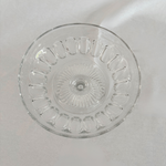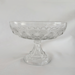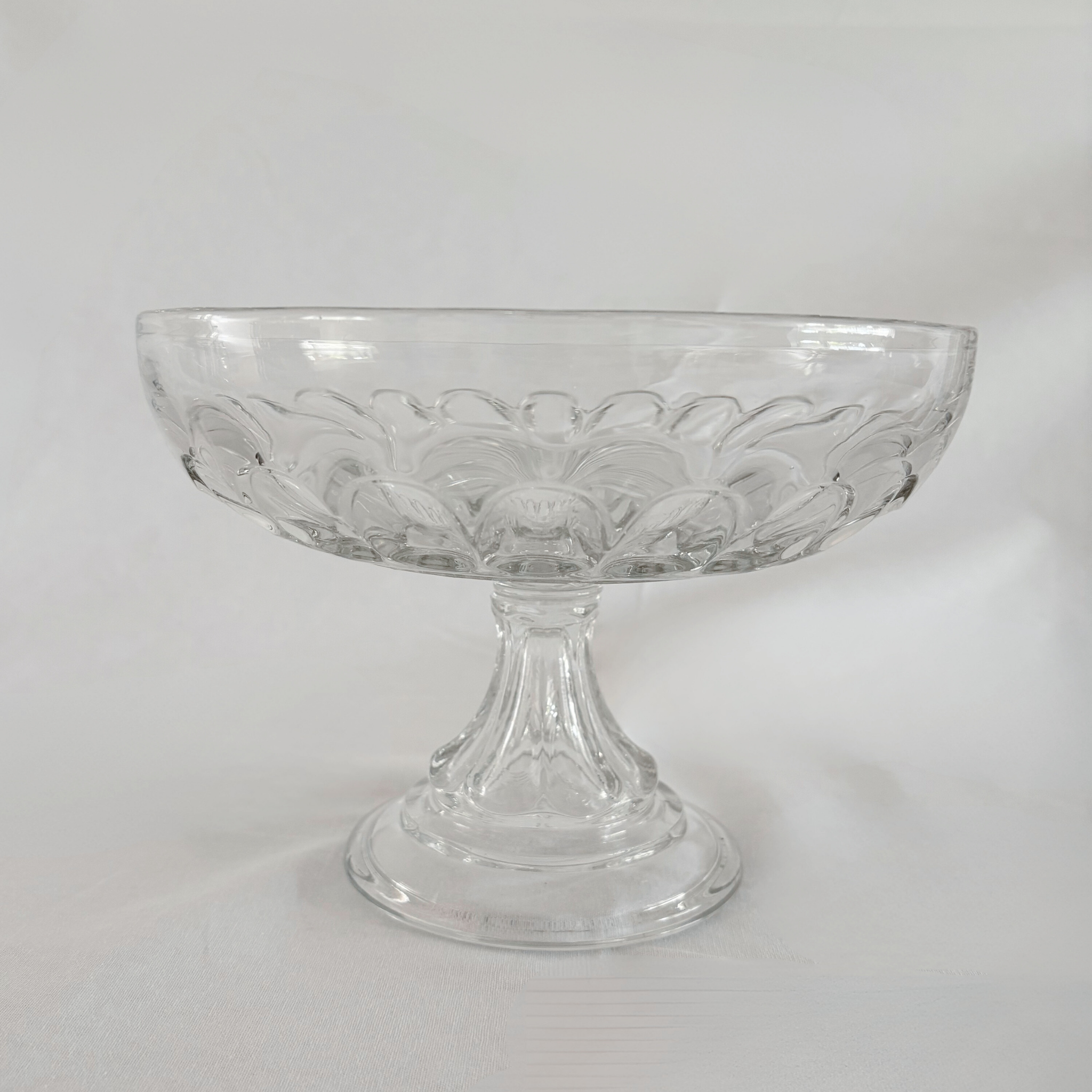 This piece reflects mid-century European pressed-glass craft, where decorative patterning was woven into everyday tableware. The petal-like repeat around the bowl nods to Art Deco floral geometry, while the stem and domed base recall classical silhouettes.